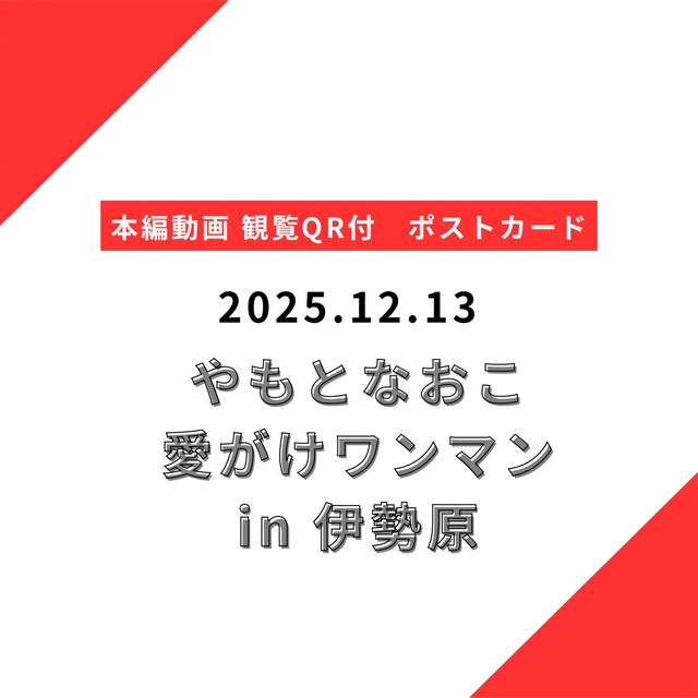 2025/12/13(土) 伊勢原プレイス2 昭和歌謡×やもソング×トミタストリングス -愛がけ Aigake - やもとなおこワンマンライブin 伊勢原 出演 やもとなおこ(Vo.Gt.) トミタコウスケ(per.) 伊澤知恵(pf.) 竹村慶子(violin) 中島伊代(viola) こちらのワンマンライブの 本編観覧QRコード付きポストカード *動画編集完了後に指定の場所にアップロードされ、観覧が可能となります。